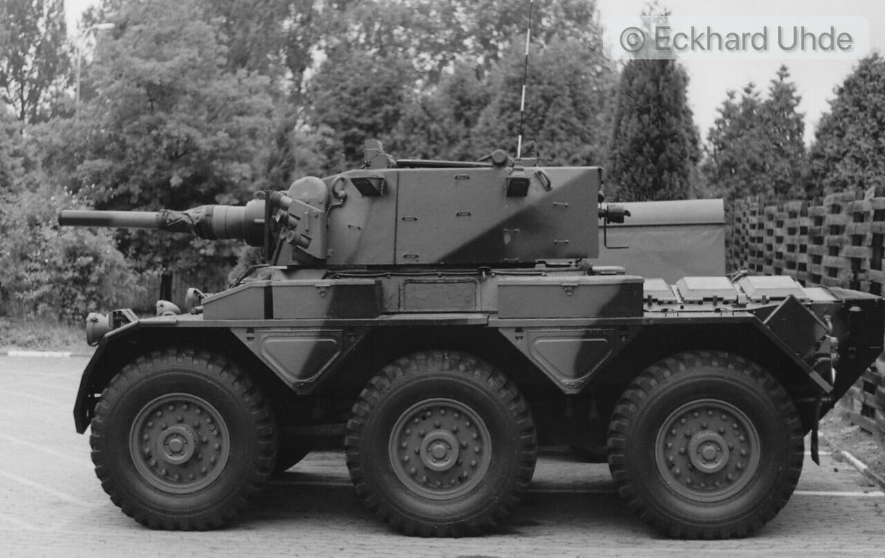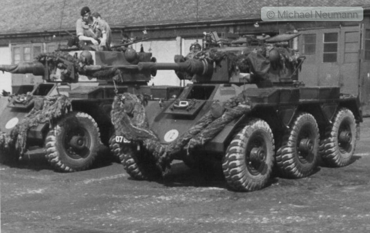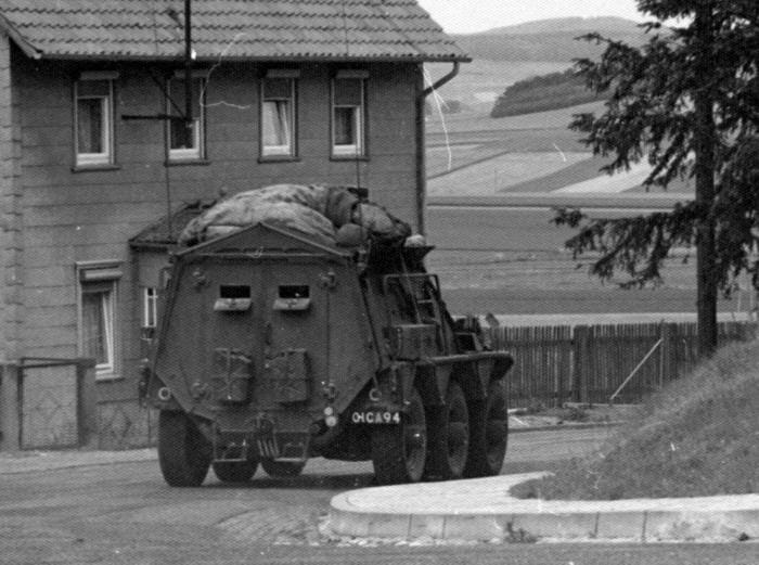 Einige Zeit später, ich brütete gerade über meinen Schularbeiten, hörte ich eins meiner Lieblingsgeräusche: der unverwechselbare Klang des Rolls-Royce B80- Motors in Kombination mit dem Abrollgeräusch der Goodyear military-tyres. Der Rolls –Royce B80 ist u. a. im Saracen und im Saladin eingebaut. Ich rannte aus dem Haus und sah gerade noch, wie ein Saladin Spähwagen vom nahe gelegenen Wald kommend ins Dorf hinein fuhr. Schnell lief ich ums Haus rum und schwang mich aufs Fahrrad. Da kam von Rotenkirchen der nächste Saladin angeheult, kurze Zeit später fuhr ein weiterer dieser dreiachsigen Spähpanzer ins Dorf. Im Mitteldorf hatten sich bereits fünf Saladin versammelt. Die Soldaten beugten sich über ihre Karten und feixten herum. Schon kamen weitere Saladins angebrummt. Bei jeder Neuankunft gab´s ein großes Hallo.