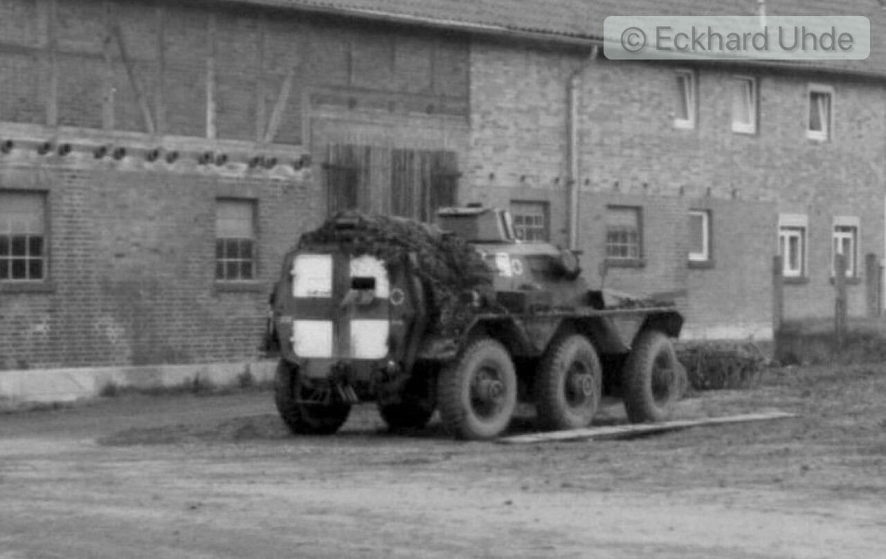 Um mir einen Überblick zu verschaffen, was hier gerade abgeht, bin ich mit dem Fahrrad schnell zu einer kleinen Anhöhe gedüst. Aus allen Richtungen sah ich über Feldwege Saladin und einige Ferrets auf Dassensen zurollen. Das waren die wahrlich glücklichen Momente für einen leidenschaftlichen Manöverbeobachter wie mich. Und so füllte sich mein Heimatdorf im Lauf des Nachmittags mit rd. 25 Saladin und ca. 10 Ferrets. Plötzlich waren auch der Austin Champ und die beiden Bedfords wieder da. Die Bedfords postierten sich nun am Spritzenhaus auf und jeder Saladin fuhr vor, nahm Sprit und Verpflegung in Empfang. Anschließend zogen die Fahrzeug auf den Gehöften unter. Ein Saladin fuhr hinter unserem Haus unters Schleppdach und wurde zugleich getarnt.