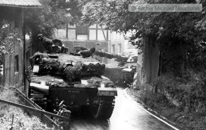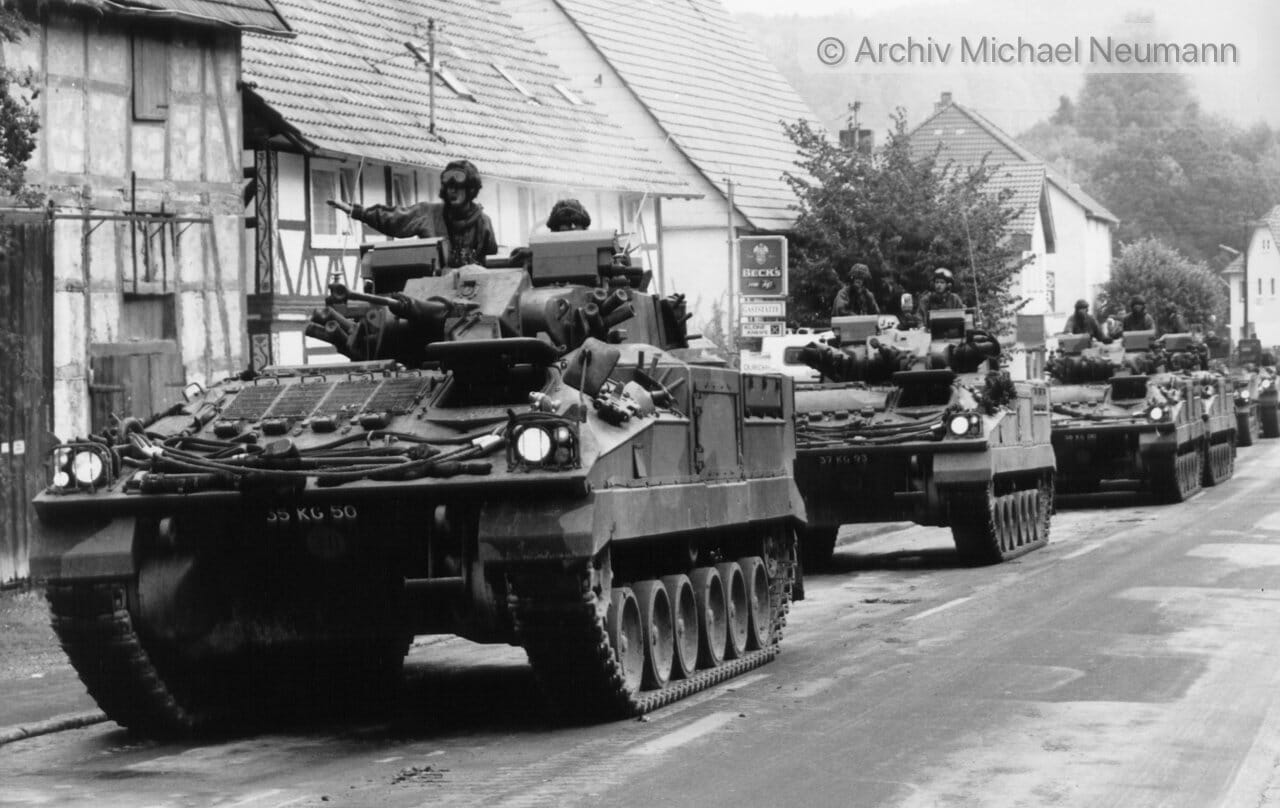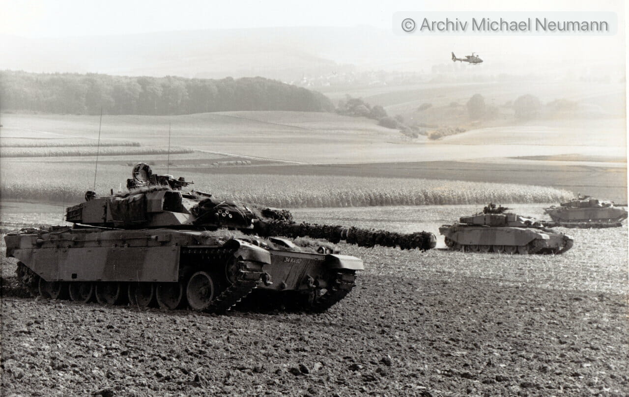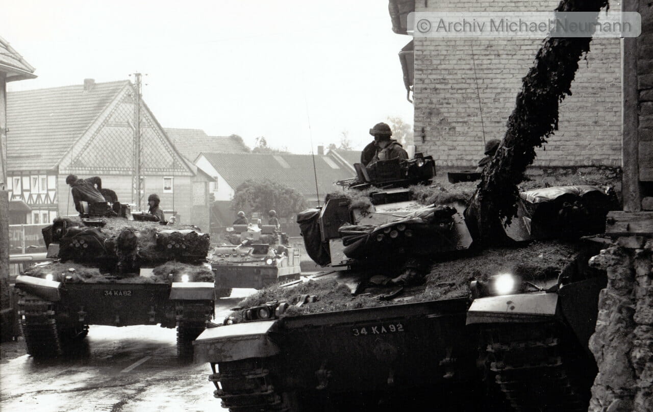 Wir, Michael Neumann und ich, hatten eine Einladung zum Besuch der Manöver erhalten und vor Ort hatten wir die Qual der Wahl: Fahren wir nach NRW zu „White Rhino“ oder zurück ins südliche Niedersachsen zu „Keyflight“. Aufgrund der räumlichen Nähe hatten wir uns für „Keyflight“ entschieden. Am Abend wurden Pressefotos herumgereicht und wir konnten uns daran bedienen. So kamen wir zu den hier gezeigten s/w-Fotos von „White Rhino“. Wir hörten die Geschichten von offenen Panzerschlachten im Bereich Warburg – Willebadessen und merkten, was wir verpasst hatten. Eine freilaufende Übung diesen Ausmaßes fand seit dem niemehr in Deutschland statt.
