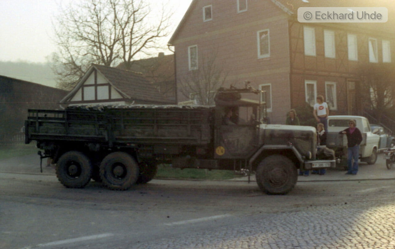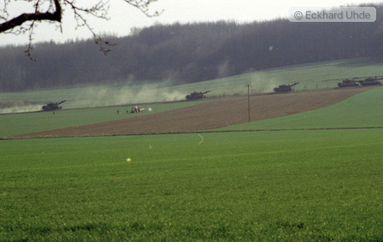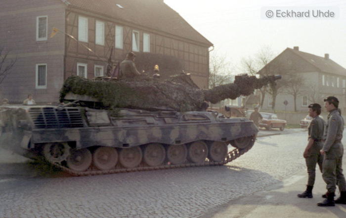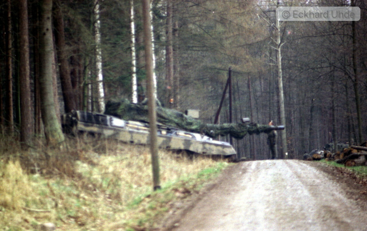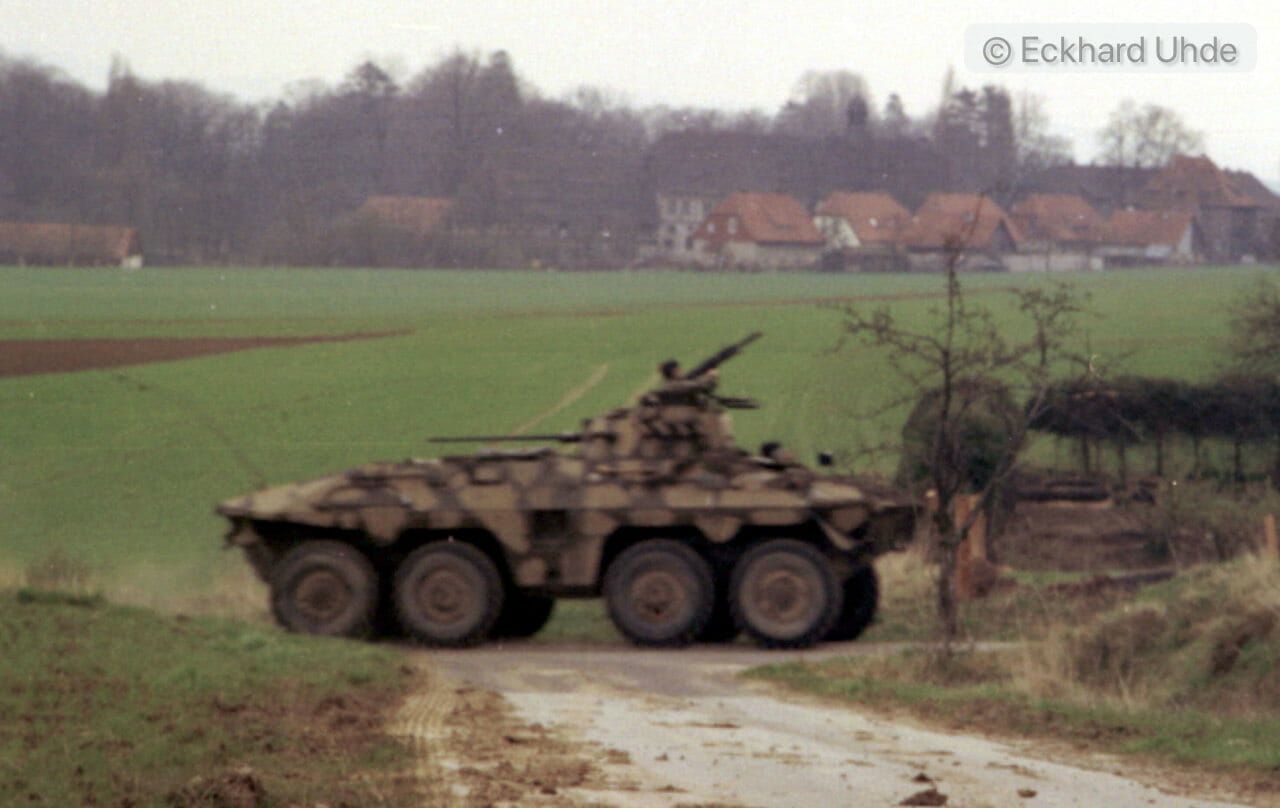 Der Verfügungsraum des PzAufklBtl 2 lag im Waldabschnitt der Ahlsburg, ca. 2 km von meinem Heimatort Dassensen entfernt. Die Luchse und Leoparden marschierten aus Richtung Northeim an und bogen hinter der Ortschaft Rotenkirchen in den Wald der Ahlsburg ab. Dort zogen sie beiderseits einer Forststraße in einem hohen Buchenwald unter. Von einer öffentlichen Telefonleitung wurde eine Leitung angezapft und so eine Feldverbindung hergestellt. Während die Stabsfahrzeuge eine Woche im Verfügungsraum blieben, zogen die Luchse und Leoparden in Richtung Weser vor. Nach zwei Tagen Abwesenheit kamen die Aufklärer zurück, um am folgenden Tag erneut in Richtung Weser aufzubrechen. Leider hatte ich sehr wenig Zeit für diese Übung, da ich mit meinem Hausbau beschäftigt war. Die wenigen Fotos zeigen den Anmarsch zum Verfügungsraum sowie das Ausfließen in Richtung des Übungsgebietes.